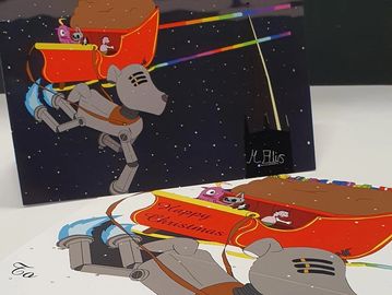 Joint Winner of our 2022 Christmas Card Competition. A high quality Christmas Card of Sparky-dolph leading a sleigh full of presents and Santa on Christmas Eve.
