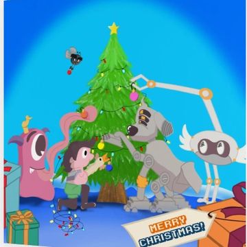 High quality Christmas Card of Sparky and Pink Alien bringing in the Studio Christmas Tree. Drawn with Photography.