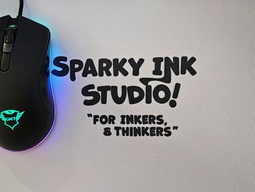 Our Sparky Ink Studio Logo Mouse mat looks amazing for desk-work and as a portable for travel!
